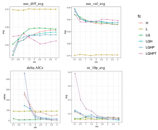 The output of MaxEnt models optimization using different combinations of regularization multipliers and feature classes (rm: regularization multiplier; fc: feature combination; L: linear features; H: hinge features; Q: quadratic features; P: product features; T: threshold features; AUC: the area under the subject curve; AICc: the Akaike information criterion corrected; auc_diff_avg: average difference between the training and testing AUC; auc_val_avg: average AUC calculated on the validation datasets; delta.AICc: the minimum information criterion AICc value; or_10p_avg: mean value of 10% training omission rate).