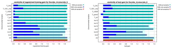 Important analysis of environmental variables based on jackknife of regularized training gain and test gain. (The dark blue bands indicate the gain from using each variable in isolation, the light blue bands indicate the gain lost by removing a single variable from the full model, and the red band indicates the gain using all variables).