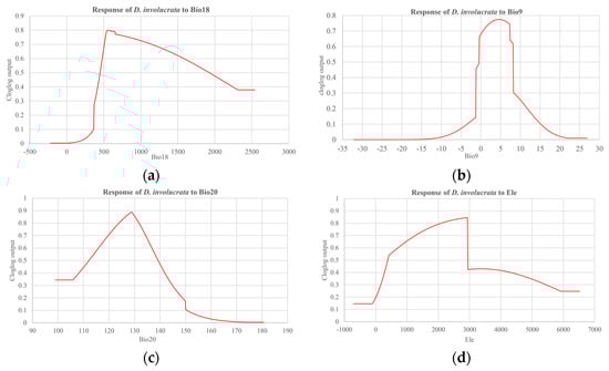 The relationship between factors and suitable areas was distinctly reflected by the single-factor response curve; meanwhile, we obtained the optimal range of values for the environmental variables from the jackknife test, which might clearly indicate the correlation between the probability of presence and environmental variables. Generally, it is believed that a probability of presence of >0.6 means the environmental factor is more conducive to species growth. According to the response curves of the main environmental factors for the suitable habitat of D. involucrata (Figure 6a–d), the optimum habitat conditions were as follows: precipitation of the warmest quarter (Bio18) was 480.24~1579.20 mm; mean temperature of the driest quarter (Bio9) was −0.36~8.14 °C; annual mean radiation (Bio20) was 115.99~136.70 W m−2d−1; and elevation (ele) was 722.76~2934.41 m.