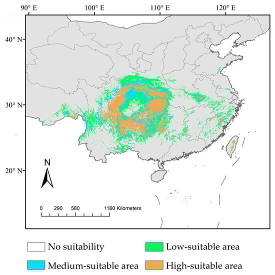 At present, the main distribution area of D. involucrata in China is 21°43′44″–32°38′17″ N, 98°18′8″–119°26′11″ E, with its potential habitat area being 98.02 × 104 km2, which is mainly located in the mountainous regions of southwest China, particularly in Sichuan, Hubei, Guizhou, and other provinces (Figure 7 and Table 2). The high-suitable habitat areas were mainly distributed in the mountainous areas around the Sichuan Basin, namely, eastern Sichuan, western Hubei, northern Guizhou, northwestern Hunan, southern Shaanxi, western Anhui, and southeastern Tibet. The medium-suitable areas were mainly distributed in the marginal area of the above high-suitable areas. Meanwhile, the distribution span of the low-suitable habitats was large, including more provinces in southern China; in addition to the adjacent regions of high- and medium-suitability areas, Zhejiang, Fujian, Taiwan, and other coastal provinces were also distributed.