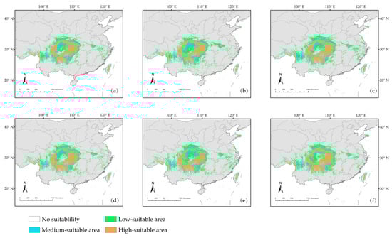 (a–f) Prediction of potential habitat areas of D. involucrata in China under future climate scenarios: (a) 2050s ssp126; (b) 2050s ssp370; (c) 2050s ssp585; (d) 2070s ssp126; (e) 2070s ssp370; and (f) 2070s ssp585.