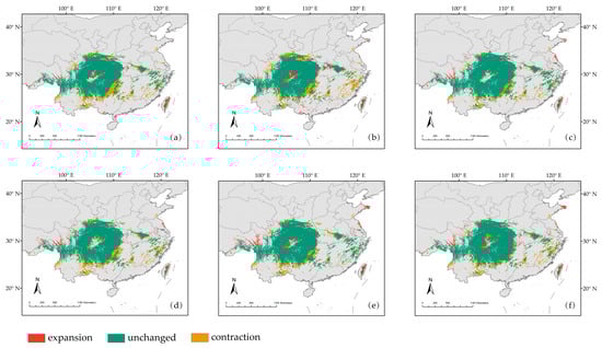(a–f) Spatial changes of the suitable habitats of D. involucrata between different future climate scenarios and current climate scenario: (a) the suitable habitats change of D. involucrata between the 2050s ssp126 scenario and current; (b) the suitable habitats change of D. involucrata between the 2050s ssp370 scenario and current; (c) the suitable habitats change of D. involucrata between the 2050s ssp585 scenario and current; (d) 2070s ssp126; (e) 2070s ssp370; and (f) 2070s ssp585. Note: “unchanged”: Suitable areas that remain unchanged under current to future climate scenarios; “contraction”: the suitable area under current climate conditions became the unsuitable area under the future scenarios; “expansion”: the unsuitable area under current climate conditions became the suitable area under the future scenarios.