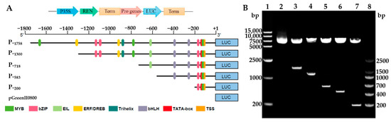 Using specific primers REF-F and REF-R, a fragment of about 1700 bp was amplified from the rubber tree’s genomic DNA by PCR (Figure 1). Sequencing results showed that the sequence length was 1758 bp, which is consistent with the genomic sequence of the HbREF1 (Gene NO. LOC110644928) promoter in NCBI, indicating that the HbREF1 promoter was successfully cloned.