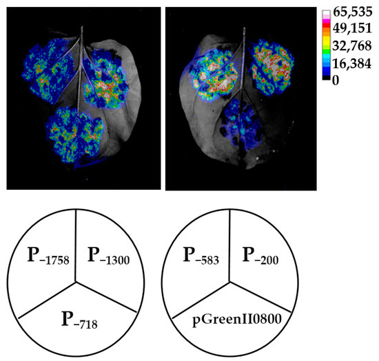 The promoter constructs were transferred into Agrobacterium tumefaciens strain GV3101(psoup19). The individual colony of transformed A. tumefaciens GV3101 harboring a promoter construct was inoculated into 3 mL LB liquid medium supplemented with rifampicin (50 μg/mL) and kanamycin (50 μg/mL) and grown for 20 h at 28 °C with an agitation of 200 rpm. Post-cultures were diluted 1:25 into 25 mL of fresh LB liquid medium containing the same antibiotics and incubated at 28 °C for 6 h with an agitation of 200 rpm. Agrobacterium cells were harvested after centrifugation at 4000× g for 10 min and resuspended in infiltration solution (10 mM MES, pH 5.7, 10 mM MgCl2, and 100 μM acetosyringone) to a final OD600 of 0.8 for agroinfiltration. The solution was infiltrated into the abaxial surfaces of fully expanded young tobacco leaves by the use of a needleless syringe [38]. The tobacco plants were maintained in a moist chamber under a 16/8 h day/night cycle at 25 °C.