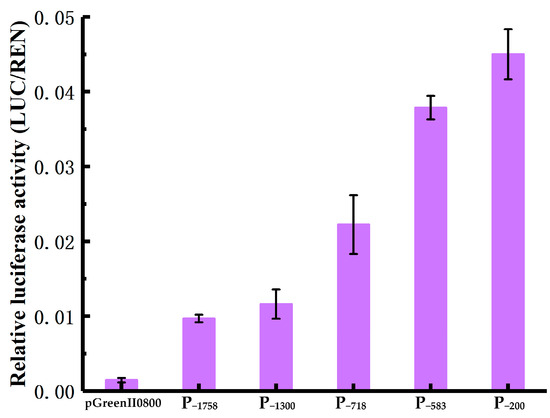 Using a dual-luciferase reporter system, the basal transcriptional activity of the HbREF1 promoter fragments was measured. The results are shown in Figure 4. Compared with the transcriptional activity of the promoter, the negative control had almost no luciferase activity. Among the five promoter fragments, P−1758 had the lowest luciferase activity and P−200 had the highest luciferase activity. As the 5′ terminal deletion fragments of the HbREF1 promoter increased, the transcriptional activity of the promoter was enhanced. The transcriptional activity of P−718 showed a greater increase than P−1300, and P−583 showed a greater increase than P−718. These results indicate that the HbREF1 promoter region of the 5′ terminal deletion fragments contained multiple elements that suppressed the transcriptional activity of the promoter, and there were strong elements that suppressed the transcriptional activity in the −1300 bp~−718 bp and −718 bp~−583 bp regions.