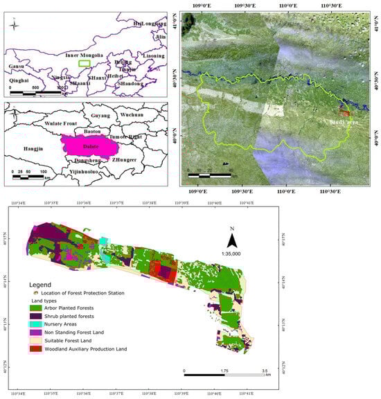 The study area is located at the Caositan Forestry Station of the Ordos Afforestation General Field in the Kubuqi Desert of the Inner Mongolia Autonomous Region (Figure 1). The geographical coordinates are 40°14′24″ N, 110°39′14″ E, located on the eastern edge of the Kubuqi Desert. The region has a temperate continental monsoon climate, with an average annual temperature of 6.1 °C, hot days, and cold nights. The average annual precipitation is 273 mm, and the precipitation in the growing season is 247 mm. Westerly and northwesterly winds prevail throughout the year, with an average wind speed of approximately 3.6 m/s. The climate type is classified as mid-temperate arid or semiarid. The growing season of Salix stands is mainly from May to September. The soil is mainly meadow wind–sand soil, and the understory herbaceous vegetation is mainly sandy vegetation.