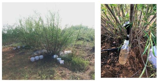 Following the method outlined by Levia and Germer [], 9 Salix clumps were randomly selected in the sample plot, as shown in Figure 2. Plastic barrels with an outer diameter of 20 cm were selected to receive penetrating rain. A total of 12 plastic barrels were placed under each Salix clump; 4 rows of collection tubes (the angle between the rows was 90°) were used. The distances between the water collection barrels under the Salix plants and the main trunk were approximately 30, 70, and 120 cm. The rainfall was calculated after the rainfall was measured using a graduated cylinder.