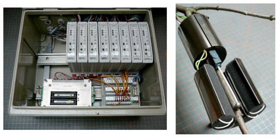 As shown in Figure 3, we utilized an EMS 62 SAP FLOW SYSTEM (Czech Republic, www.emsbrno.cz (12 December 2023)) for sap flow measurements. The measuring principle is based on the stem heat balance method (SHB) with external heating and internal temperature sensing [,]. Within the test area, we selected three well-developed and moderately sized individual Salix clumps. For each clump, we chose standard branches in four cardinal directions: east, west, south, and north. To measure sap flow, we employed a 0.8 mm diameter drill to create holes in the xylem of the Salix stem, where we installed stemflow sensors. These sensors were enclosed in tinfoil bags and securely fastened with insulating tape. Stem sap flow in the Salix plants was continuously monitored throughout the growing season using Mini32 data collection devices, which collected and recorded fluid flow data. The measured sap flow rate was then extrapolated from individual branches to the forest stand level.