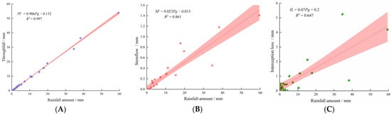 Rainfall in forests is an important factor affecting rainfall redistribution. As shown in Figure 4, based on regression analysis and curve fitting, rainfall was positively correlated with throughfall rainfall, stemflow, and canopy interception (p < 0.01), which showed that throughfall, stemflow, and canopy interception increased with increasing rainfall. As calculated from the linear regression equation, the throughfall threshold was approximately 0.15 mm, which was similar to the measured value. The threshold value generated by stemflow was approximately 0.57 mm; because of the influence of factors such as canopy structure, wind direction, and rain speed under natural conditions, this value was slightly lower than the measured value.