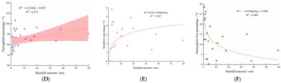 The correlation between rainfall redistribution and rainfall amount. (A) The correlation between rainfall amount and throughfall. (B) The correlation between rainfall amount and stemflow. (C) The correlation between rainfall amount and interception loss. (D) The correlation between rainfall amount and throughfall percentage. (E) The correlation between rainfall amount and stemflow percentage. (F) The correlation between the rainfall amount and interception loss percentage.