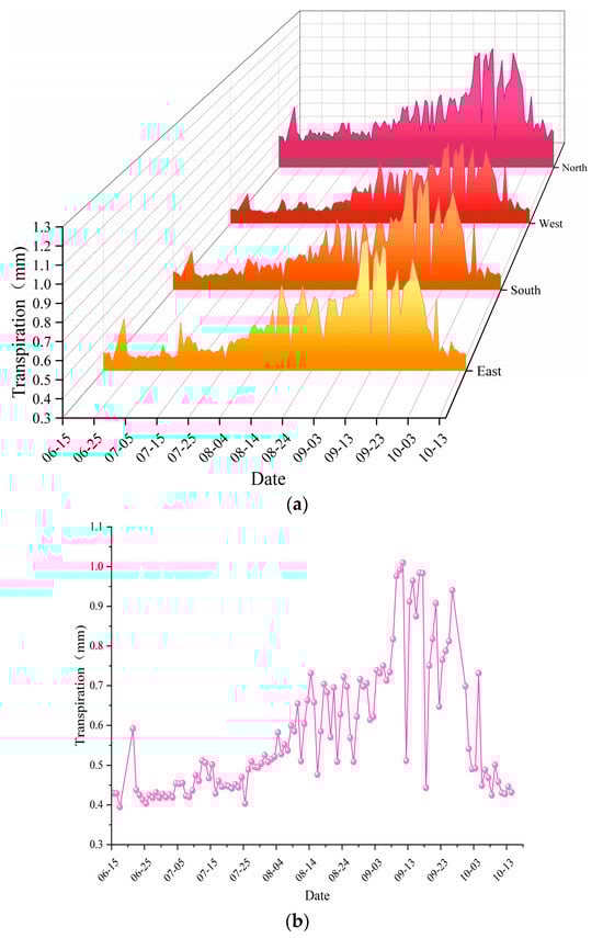 As illustrated in Figure 5a, vegetation transpiration in different directions exhibited the same trend over time. The transpiration of branches on the north side was significantly greater than that on the other three sides. The mean transpiration values in different directions were calculated, and a Salix transpiration change curve was plotted from June 15 to October 15, as depicted in Figure 5b. The total transpiration of Salix during the study period was 67.47 mm, the average daily transpiration was 0.58 mm, and the maximum transpiration was 1.01 mm. Transpiration showed obvious differences between seasons, with an overall parabolic shape. The daily average transpiration volume in June and July was 0.45 mm. The transpiration volume began to increase significantly in August and peaked in early September. The daily average transpiration volume in August and September was 0.69 mm, and then, it began to decrease significantly in October.
