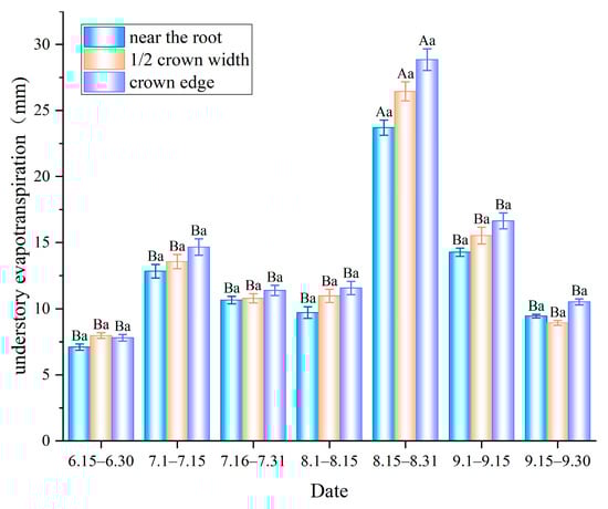Understory evapotranspiration of Salix reservoir at different locations (Among them, capital letters represent the differences between groups in different time periods, and lowercase letters represent the differences within groups between different distances in each group of time periods).