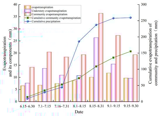 Vegetation transpiration, soil evaporation, and vegetation canopy interception are collectively called ecosystem total evapotranspiration [,]. Vegetation evapotranspiration is by far the largest water flux on the Earth’s land surface. The core components of quantitative evapotranspiration are the determination of water use efficiency and an estimation of the system water balance. A large number of evapotranspiration research methods have been derived from this type of research, including remote sensing research [], vorticity research [], Bowen ratio research [], etc. Each measurement method has advantages and disadvantages. The remote sensing estimation method is affected by the time of the image and spatial resolution limitations [], and the Bowen ratio method and disaster correlation method are difficult to use to calculate evapotranspiration measurements at the regional/large watershed scale []. Therefore, simultaneous field research on rainfall canopy interception, plant transpiration, and soil evaporation is the most accurate and reliable method to obtain total evapotranspiration from forestland []. In addition, the amount of soil water also has a certain impact on the water balance of forestland, especially in arid inland river areas with shallow groundwater levels. The connectivity of the soil will affect the supply of underground runoff and groundwater. In this regard, it is necessary to monitor the changing characteristics of the soil moisture content within the vegetation ecosystem in a dynamic manner [].