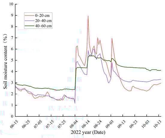 Changes in the soil moisture content in each soil layer of the Salix shelterbelt in 2022.