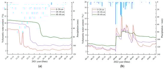 The changes in soil moisture in the Salix plantation in the winter of 2021 are shown in Figure 9a. It can be observed that the soil moisture content showed a significant downward trend from November to December. This may be due to very low temperatures, low temperatures, and frost in December. The water in the soil freezes, causing the soil moisture content to plummet. At the same time, the soil moisture content was basically stable from December to March of the next year, and a small amount of snowfall did not have a significant impact on the soil moisture content. From the perspective of different soil layers, the 40–60 cm soil layer has the highest water content, and the 0–20 cm soil layer has the lowest water content. This may be because the Salix root system is mainly distributed at 40–60 cm, and the root system absorbs soil water, causing the deep soil water content to be higher. This may also be caused by the accumulation of rainfall that penetrates into the deep layers and is not easily discharged.
