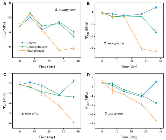Variations in leaf water potential of Reaumuria soongorica (Pall.) Maxim. (A,B) and Salsola passerina Bunge (C,D) during water treatments. Data are mean ± SE. Abbreviations: ΨPD, predawn leaf water potential; ΨMD, midday leaf water potential.