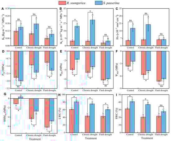 Variation in water use efficiency (A–C), embolism resistance (D), leaf water potential (E,F), hydraulic safety margin (G), and leaf and stem water content (H,I) between different species or treatment. Lowercase letters indicate the variation between treatments for Reaumuria soongorica (Pall.) Maxim. traits (p < 0.05), and capital letters indicate the variation between treatments for Salsola passerina Bunge traits (p < 0.05). ‘*’ indicates significant differences between R. soongorica and S. passerina (p < 0.05), and ns indicates no difference (p > 0.05). Abbreviations: KS, sapwood specific conductivity; KL, leaf specific conductivity; Hv, Huber value; P50, pressure value in xylem at 50% loss of hydraulic conductivity; ΨPD, predawn leaf water potential; ΨMD, midday leaf water potential; HSM50, hydraulic safety margin; LWC, leaf water content; SWC, steam water content.