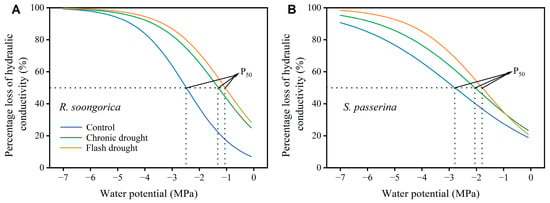 Vulnerability curves of Reaumuria soongorica (Pall.) Maxim. (A) and Salsola passerina Bunge (B) under different drought treatments. Abbreviations: P50, pressure value in xylem at 50% loss of hydraulic conductivity.