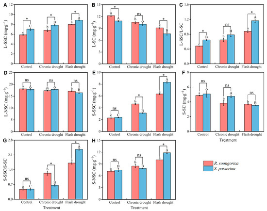 Variation in soluble sugar concentration (A,E), starch concentration (B,F), ratio of soluble sugar to starch concentration (C,G), and non-structural carbon concentration (D,H) between different species or treatments. Lowercase letters indicate the variation between treatments for Reaumuria soongorica (Pall.) Maxim. traits (p < 0.05), and capital letters indicate the variation between treatments for Salsola passerina Bunge traits (p < 0.05). ‘*’ indicates significant differences between R. soongorica and S. passerina (p < 0.05), and ns indicates no difference (p > 0.05). Abbreviations: L-SSC, leaf soluble sugar concentration; L-SC, leaf starch concentration; L-SSC/L-SC, ratio of leaf soluble sugar to starch concentration; L-NSC, leaf non-structural carbon concentration; S-SSC, stem soluble sugar concentration; S-SC, stem starch concentration; S-SSC/S-SC, ratio of stem soluble sugar to starch concentration; S-NSC, stem non-structural carbon concentration.