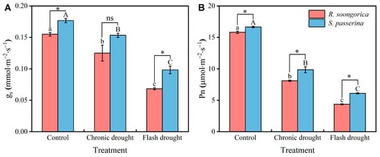 Variation in stomatal conductance (A) and net photosynthetic rate (B) between species or treatments. Lowercase letters indicate the variation between treatments for Reaumuria soongorica (Pall.) Maxim.traits (p < 0.05), and capital letters indicate the variation between treatments for Salsola passerina Bunge traits (p < 0.05). ‘*’ indicates significant differences between R. soongorica and S. passerina (p < 0.05), and ns indicates no difference (p > 0.05). Abbreviations: gs, stomatal conductance; Pn, net photosynthetic rate.