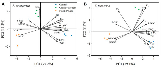 Principal component analysis of Reaumuria soongorica (Pall.) Maxim. (A) and Salsola passerina Bunge (B) traits. Abbreviations: KS, sapwood specific conductivity; KL, leaf specific conductivity; Hv, Huber value; P50, pressure value in xylem at 50% loss of hydraulic conductivity; ΨPD, predawn leaf water potential ΨMD, midday leaf water potential; HSM50, hydraulic safety margin; LWC, leaf water content; SWC, steam water content; L-SSC, leaf soluble sugar concentration; L-SC, leaf starch concentration; L-NSC, leaf non-structural carbon concentration; S-SSC, stem soluble sugar concentration; S-SC, stem starch concentration; S-NSC, stem non-structural carbon concentration; gs, stomatal conductance; Pn, net photosynthetic rate.