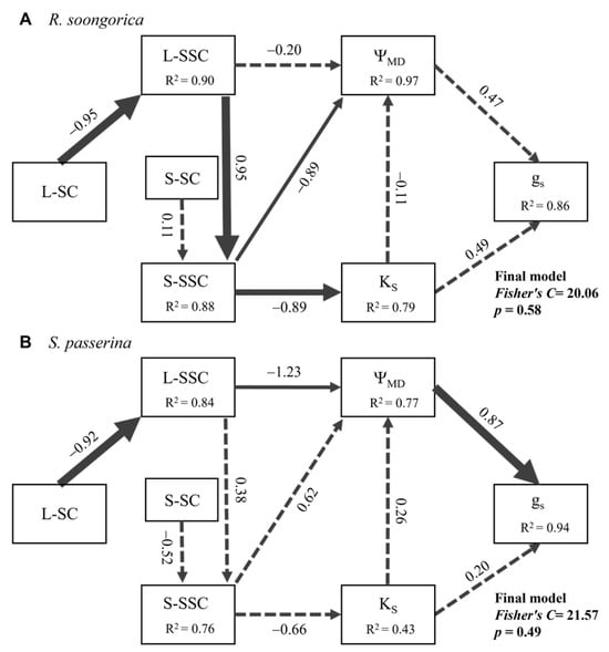Results of pathways from piecewise structural equation models (pSEM) demonstrating the relationship between the Reaumuria soongorica (Pall.) Maxim. (A) or Salsola passerina Bunge (B) traits, respectively. The weights of the solid arrows correspond to p-values, where the thickest is <0.001, intermediate is <0.01, and thinnest is <0.05. The dotted arrows correspond to p > 0.05. Values on each arrow indicate the standardized parameter coefficient estimates for each pathway. The final model shows Fischer’s C and p-values as well as R2 for each pathway. Abbreviations: KS, sapwood specific conductivity; ΨMD, midday leaf water potential; L-SSC, leaf soluble sugar concentration; L-SC, leaf starch concentration; S-SSC, stem soluble sugar concentration; S-SC, stem starch concentration; gs, stomatal conductance.