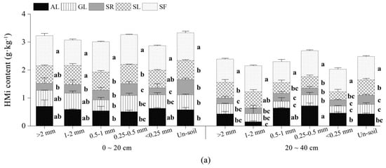 Except for 0.5–1 mm particle size, the HMi distribution proportion of each particle size was noticeably higher in the 0–20 cm soil layer in the AL stage than it was in the other vegetation restoration stages. The HMc content in the AL soil was significantly higher than that in the other vegetation restoration stages. The distribution ratio of the HMr in the SF was significantly higher than that in the AL and GL.