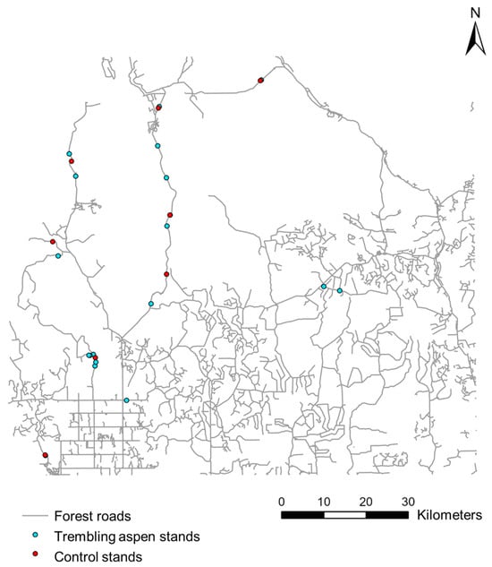 Location of forest roads and sampled stands in the study landscape. The stands sampled include 19 aspen stands located along roads, as well as 8 stands containing no aspen as control stands.