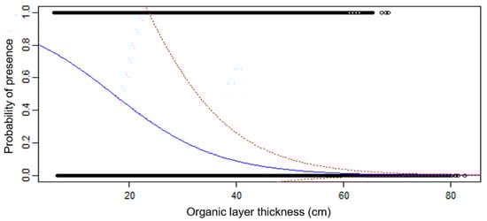 Probability of aspen presence according to organic layer thickness. The blue line represents the logistic regression curve. Red lines represent 95% confidence intervals. Circles represent aspen presence/absence observations.