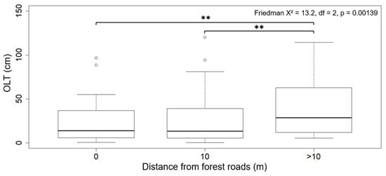 Thickness of organic layer (OLT) according to distance from forest roads. Transects parallel to roads form a single distance class (0 m). Transects perpendicular to roads are divided into two distance classes (10 m and >10 m). The results of the Friedman test are shown. The symbol ** indicates significant differences between distance classes according to the results of the post hoc exact test with Holm correction (p < 0.01).