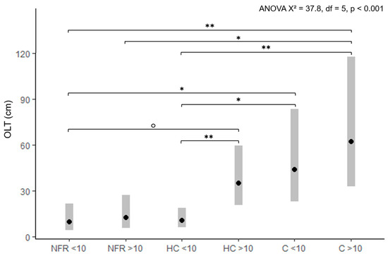 Significant differences in the OLT according to the distance from the roads (X2 = 37.8, df = 5, p = 4.16 × 10−7; Figure 4) were also identified by the ANOVA performed on the habitats where the roads play no functional role (NFR), where they constitute habitat corridors (HC), and control habitats (C). Furthermore, the OLT appears to explain the distribution of aspen along the road network. Thus, the OLT does not vary significantly with the distance from the roads for the NFR habitats where aspen is present both near and far from the roads (Figure 4). The mean OLT value for these habitats is around 10 cm, which, according to our logistic regression model, corresponds to a probability of aspen presence of over 60%. Similarly, the OLT does not vary significantly with the distance from the roads for the C habitats, where aspen is absent. The mean OLT value for these habitats is around 50 cm, corresponding to an almost zero percent probability of aspen presence (Figure 2). The OLT, on the other hand, varies significantly with the distance from the roads in the HC habitats (Figure 4), where aspen is abundant close to the roads, but scarce or absent far from them. In these habitats, the mean OLT value within 10 m of the roads is 10 cm and does not differ significantly from the OLT values in the NFR habitats. At more than 10 m from the roads, the mean OLT value is 35 cm and does not differ significantly from the C habitats (Figure 4).