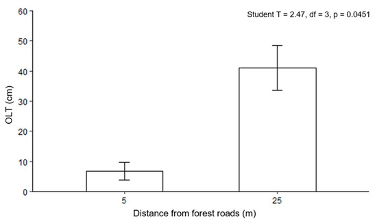 Average organic layer thickness (OLT) at 5 m and 25 m from forest roads based on the soil profiles of 4 stands where roads act as functional habitat corridors. Error bars represent standard errors. Results of the Student’s paired-sample test are shown.