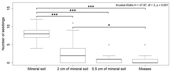 Number of aspen seedlings by substrate type (i.e., treatment). The results of the Kruskal–Wallis test are shown. The symbols * and *** indicate significant differences between treatments according to the results of Dunn’s post hoc test with Holm correction (p < 0.05 and p < 0.001, respectively).