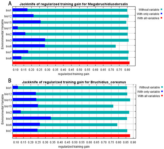 Jackknife test evaluation of the relative importance of major bioclimatic variables on distributions of the species Megabruchidius dorsalis (A) and Bruchidius coreanus (B).