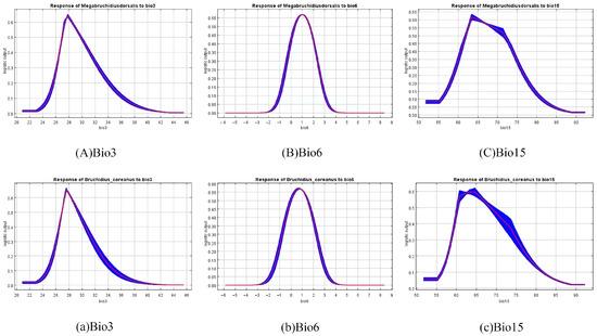Response curves of main bioclimatic variables in predictions of suitable areas for Megabruchidius dorsalis (A–C) and Bruchidius coreanus (a–c).