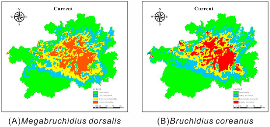 Potential distributions of Megabruchidius dorsalis (A) and Bruchidius coreanus (B) under current climatic conditions.