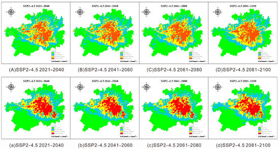 Under current climate conditions, the area classified as highly suitable M. dorsalis habitat accounted for 14.1494% of Guizhou Province, mainly in the southern part of Zunyi City, the northeast of Qiannan Prefecture, the area throughout Guiyang City, the northwest of Qiandongnan Prefecture, the eastern and central regions of Bijie City, Pingba District in the northeast part of Anshun City, and various areas in the southwest of Tongren City. Areas of moderately suitability made up 19.8092% of Guizhou Province, mainly distributed in Qingzhen City of Guiyang City, Fenggang County of Zunyi City, Qianxi County of Bijie City, Pingtang County of Qiannan Prefecture, Rongjiang County of Qiandongnan Prefecture, Pingba District of Anshun City, Shiqian County of Tongren City, and Liuzhi Special Zone of Liupanshui City. Poorly suitable and unsuitable areas were 20.2862% and 45.7552% of Guizhou, respectively, distributed in the peripheral areas of the province; Qianxinan Prefecture was an unsuitable area.