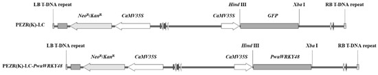 For construction of the recombinant expression vector, a pair of primers (PwuWRKY48LCF: 5′-CCCAAGCTTATGAATGAAATGAAGGAGAATAAT-3′: PwuWRKY48LCR: 5′-TGCTCTAGACTACTCCTCTTTAGGCTCCT-3′) were further designed at both ends of the PwuWRKY48 gene with HindⅢ and XbaⅠ cleavage sites, respectively. The full-length gene fragment of PwuWRKY48 was amplified and recovered. Both the gene fragment and the purified expression vector PEZR-(K)-LC plasmid were digested with HindIII and XbaI and ligated with T4-DNA ligase (Takara, Dalian, China) (Figure 1), then transformed into E. coli. The recombinant plasmid was extracted and transformed into Agrobacterium tumefaciens GV3101. The positive clones were identified and used for the subsequent genetic transformation.