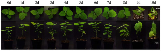 Phenotype performance of P. wulianensis plants in drought treatment (0 d–10 d). The upper row displays an aerial view of entire plant, and the lower shows the state of the plant.