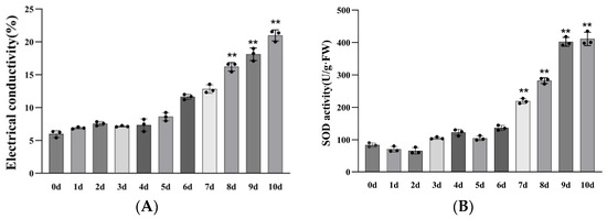 Performance of relative electrical conductivity (A) and SOD activity (B) in P. wulianensis under drought treatment. Three biological replicates were conducted. The error bars represent standard deviation. Asterisks indicate significant differences between the data at the treatment day (1 d−10 d) and control (0 d) (t test, p < 0.05).