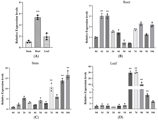 The PCR tests showed that PwuWRKY48 was expressed in all tissues of stems, roots, and leaves of P. wulianensis (Figure 4A) under normal growth conditions. It had the highest expression value in roots, 1.8 to 4.3-fold higher than those in the stems and leaves, respectively. In the early days of water control (0 d–5 d), the PwuWRKY48 expression model displayed first an upward and then a downward trend in the roots. It reached the peak at 1 d and 2 d of stress treatment, both 2.0-fold higher than those at 0 d (Figure 4B). In the later stress treatment (6 d–10 d), PwuWRKY48 expression displayed a continuous increase. Additionally, PwuWRKY48 had relatively low expression in the stems in the early days of water control, then gradually increasing later. It reached its peak at 10 d with an expression level 17.6-fold higher than that at 0 d (Figure 4C). In leaves, PwuWRKY48 had relatively low expression in the early days of water control, then increasing sharply at 8 d. It reached a peak at 9 d with an expression level 28.7-fold higher than that at 0 d, and then gradually decreased (Figure 4D). In summary, P. wulianensi roots are sensitive to water deficiency, while leaves and stems were somewhat insensitive until real drought stress started.