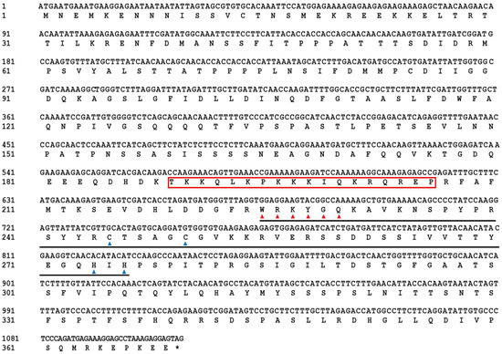 Nucleotide sequence and amino acid sequence of PwuWRKY48. The WRKY domains are identified by the black line. The conserved WRKYGQK motif and zinc finger motif are indicated by red and blue triangles, respectively. A predicted nuclear localization signal is framed in red.