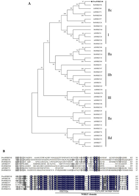 Phylogenetic tree (A) and multiple sequence alignment (IIc) (B) of WRKY proteins. Multiple sequence alignment was conducted using ClustalW. The pentagram is indicated the target protein (PwuWRKY48). Light to dark colors are indicated by low to high similarity. A phylogenetic tree was constructed using MEGA-X with the maximum likelihood method, 1000 repetitions of bootstrap tests, and JTT matrix-based model. The figure was generated by use of DNAMAN 9.0 software. PtrWRKY56, Potri.008G094000.1; AtWRKY48, AT5G49520.1; AtWRKY71, AT1G29860.1; PtrWRKY68, Potri.004G007500.1; AtWRKY57, AT1G69310.1; AtWRKY24, AT5G41570.1; PtrWRKY32, Potri.006G184800.1; PtrWRKY44, Potri.006G133200.2; AtWRKY4, AT1G13960.1; AtWRKY26, AT5G07100.1; AtWRKY20, AT4G26640.1; PtrWRKY20, Potri.011G087900.1; AtWRKY40, AT1G80840.1; PtrWRKY40, Potri.001G044500.1; PtrWRKY18, Potri.006G263600.1; AtWRKY60, AT2G25000.1; PtrWRKY9, Potri.001G208600.1; AtWRKY47, AT4G01720.1; PtrWRKY47, Potri.002G186600.2; PtrWRKY31, Potri.002G228400.3; AtWRKY42, AT4G04450.1; AtWRKY6, AT1G62300.1; PtrWRKY42, Potri.011G007800.2; AtWRKY38, AT5G22570.1; PtrWRKY70, Potri.016G137900.1; AtWRKY30, AT5G24110.1; AtWRKY53, AT4G23810.1; PtrWRKY46, Potri.002G168700.1; PtrWRKY41, Potri.001G092900.1; AtWRKY29, AT4G23550.1; PtrWRKY27, Potri.017G149000.1; PtrWRKY65, Potri.011G070100.1; AtWRKY35, AT2G34830.1; AtWRKY14, AT1G30650.1; PtrWRKY21, Potri.003G111900.2; AtWRKY74, AT5G28650.1; AtWRKY39, AT3G04670.1; PtrWRKY51, Potri.018G139300.1; AtWRKY7, AT4G24240.1; PtrWRKY15, Potri.007G047400.1.