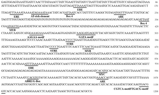A promoter fragment of PwuWRKY48 with a length of 1208 bp (GenBank accession # PP101019) was cloned using P. wulianensis DNA as a template (Figure 7). The cis-acting elements in the sequence were determined and showed it contained typical TATA-box and CAAT-box, as well as some adversity-responsive elements such as MYB, ARE, ABRE, CGTCA-motif, and TGACG-motif (Figure 7) and some light-response elements such as GATA-motif, Box 4 and G-Box. Accordingly, PwuWRKY48 expression is in response to light signaling and abiotic stresses.