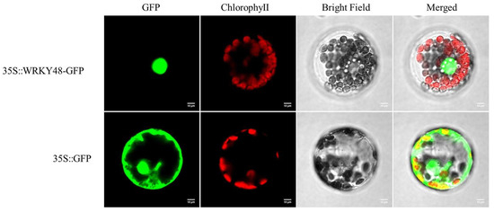 The 35S::WRKY48-GFP fusion vector and 35S::GFP empty control, respectively, were transformed into tobacco protoplasts using PEG-mediated transformation. The fluorescence signal showed that the WRKY48-GFP protein was only addressed in the nucleus, but the fluorescent signal of the control covered the whole cell (Figure 8). This indicates that PwuWRKY48 is a nuclear localization protein and might function as a regulator by binding to the promoter region of the target genes.