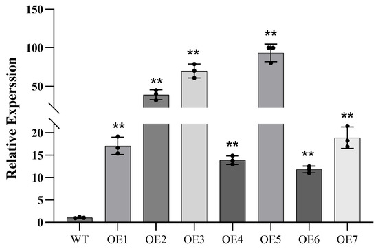 Transformation of PwuWRKY48 was conducted. Based on DNA tests, seven positive lines (OE1–OE7) were obtained. Gene expression assay showed that OE2, OE3, and OE5 had high expression of PwuWRKY48, 40.2, 70.6, and 91.4 times higher than the wild type, respectively (Figure 9). These three lines were selected for the subsequent resistance evaluation.