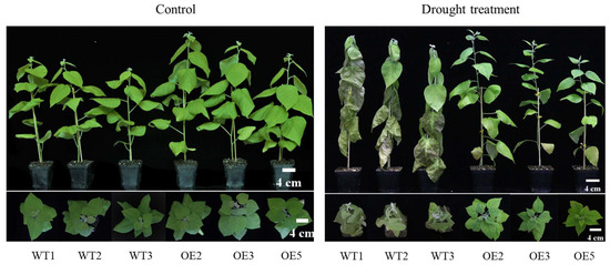 The three OE lines were vegetatively propagated. After 2 months of transplanting, three plants from each line with consistent growth were subjected to drought treatment. The results showed that there was no significant morphological difference between the transgenic and wild-type plants under regular growth conditions (Figure 10). At 8 d of drought stress, most leaves of the wild type wilted, while the OE lines grew better with a few basal leaves wilting slightly.