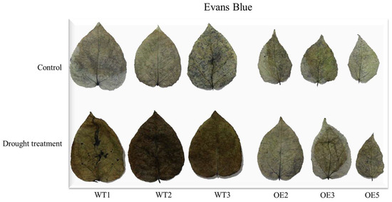 Evans blue staining assays showed that the coloration of the wild-type and OE leaves was similar under regular conditions (Figure 11). However, the coloring area of wild type leaves increased significantly at 8 d of drought stress, while the leaves’ coloring in OE lines increased a little compared to that before drought treatment. Obviously, OE lines had better cell activity and more drought tolerance than the wild type.
