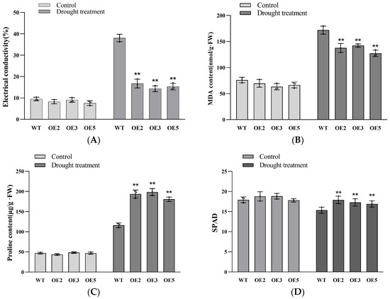 Performance of the physiological indexes under drought stress. (A) Relative conductivity; (B) malondialdehyde content (MDA); (C) proline content; (D) chlorophyll relative value. Three biological replicates were used in the experiment. Error bars indicate the standard deviation. The asterisks indicate significant differences between the transgenic and wild-type lines under drought treatment (t test, p < 0.05).