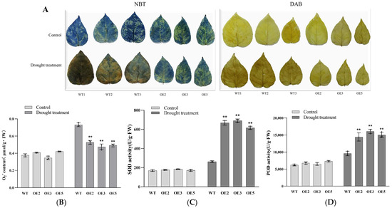 NBT and DAB staining of plant leaves showed that the wild-type and OE lines performed similarly under regular growth conditions. At 8 d of drought stress, all the lines colored more deeply. Of them, the wild type exhibited significant changes while the OE lines changed a little (Figure 13A). Further measurement of O2·− content showed that all were at a low level and no significant difference was found between the wild-type and OE lines under regular growth conditions, but O2·− content increased significantly under drought stress in all lines. That in OE lines increased less, 0.7-fold in comparison with the wild type at 8 d of drought stress (Figure 13B). Similarly, SOD and POD activities in both wild-type and OE lines were maintained at low levels under normal conditions and no significant differences were found between them. However, under drought stress, SOD and POD activities increased in all lines. SOD activity was 2.5-fold higher and POD activity was 1.6-fold higher in OE lines than the wild type at 8 d of drought stress (Figure 13C,D). These results reveal that overexpressing PwuWRKY48 could significantly reduce O2·− accumulation in leaves under drought stress, which is beneficial for regular metabolic activity in cells.